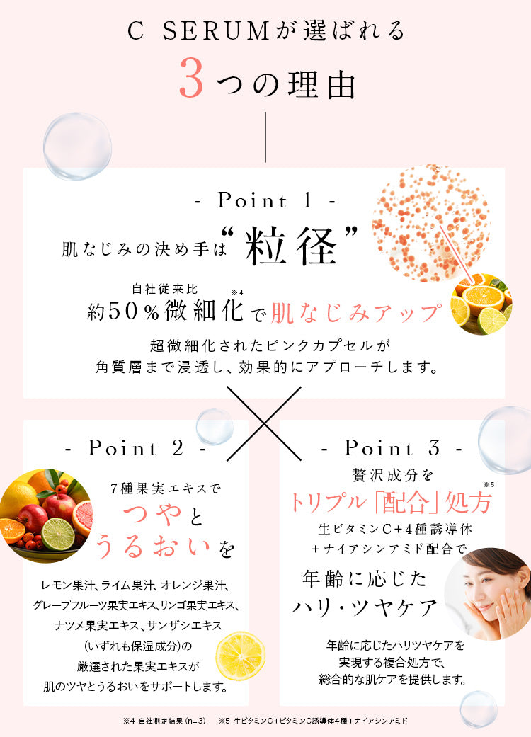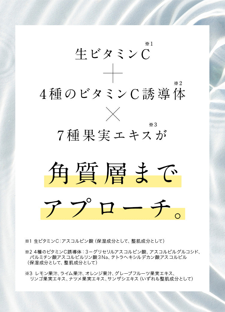 水、BG、グリセリン、ペンチレングリコール、アスコルビン酸、3 ーグリセリルアスコルビン酸、アスコルビルグルコシド、パルミチン酸アスコルビルリン酸3Na、テトラヘキシルデカン酸アスコルビル、ナイアシンアミド、フラーレン、グリチルリチン酸2K、加水分解コラーゲン、スクワラン、ヒアルロン酸Na、セラミドNP、セラミドAP、セラミドNG、酵母エキス、ツボクサエキス、レモン果汁、ライム果汁、オレンジ果汁、グレープフルーツ果実エキス、リンゴ果実エキス、ナツメ果実エキス、サンザシエキス、アルギン酸Na、カルボマー、アルカリゲネス産生多糖体、キサンタンガム、PVP、水添レシチン、フィトステロールズ、ポリソルベート80、酸化チタン、酸化鉄、水酸化K、フェノキシエタノール |