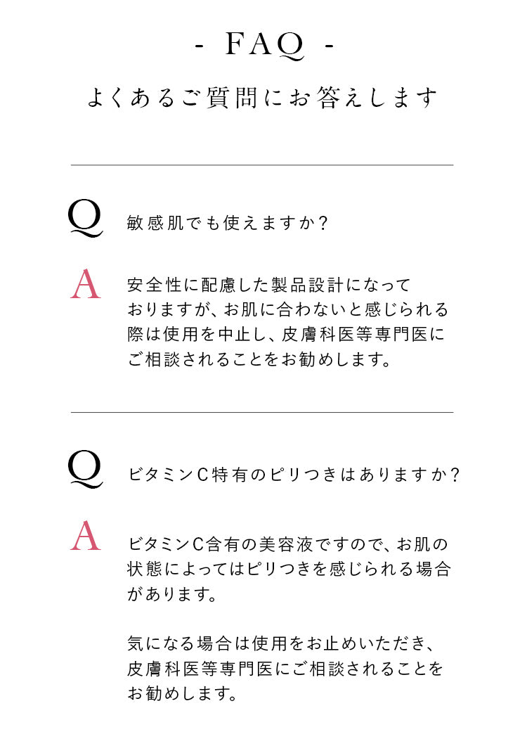 ●お肌に異常が生じていないかよく注意して使用してください。化粧品がお肌に合わないとき、即ち次のような場合には、使用を中止してください。そのまま使用を続けますと症状を悪化させることがありますので皮膚科専門医等にご相談されることをおすすめします。 |